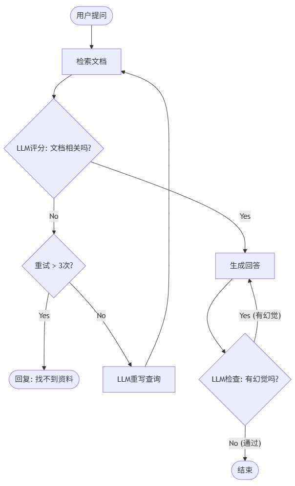 max_retries(如 3 次)。如果反复重写 Query 还是搜不到,说明知识库里真没有,此时应优雅降级(Fallback),而不是让 Agent 陷入无限循环消耗 Token。